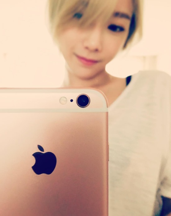 사진에서 태연은 로즈골드 색상의 아이폰6s를 들고 거울 셀카를 찍고 있다.