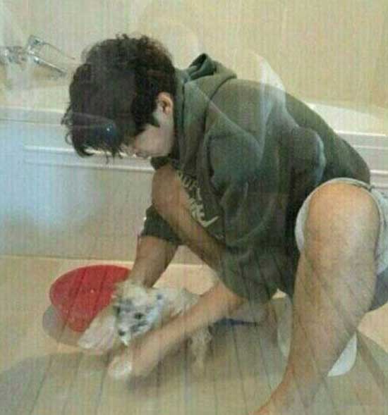 윤계상은 과거 자신의 팬카페에 욕실에서 강아지를 씻기는 사진을 올렸다.