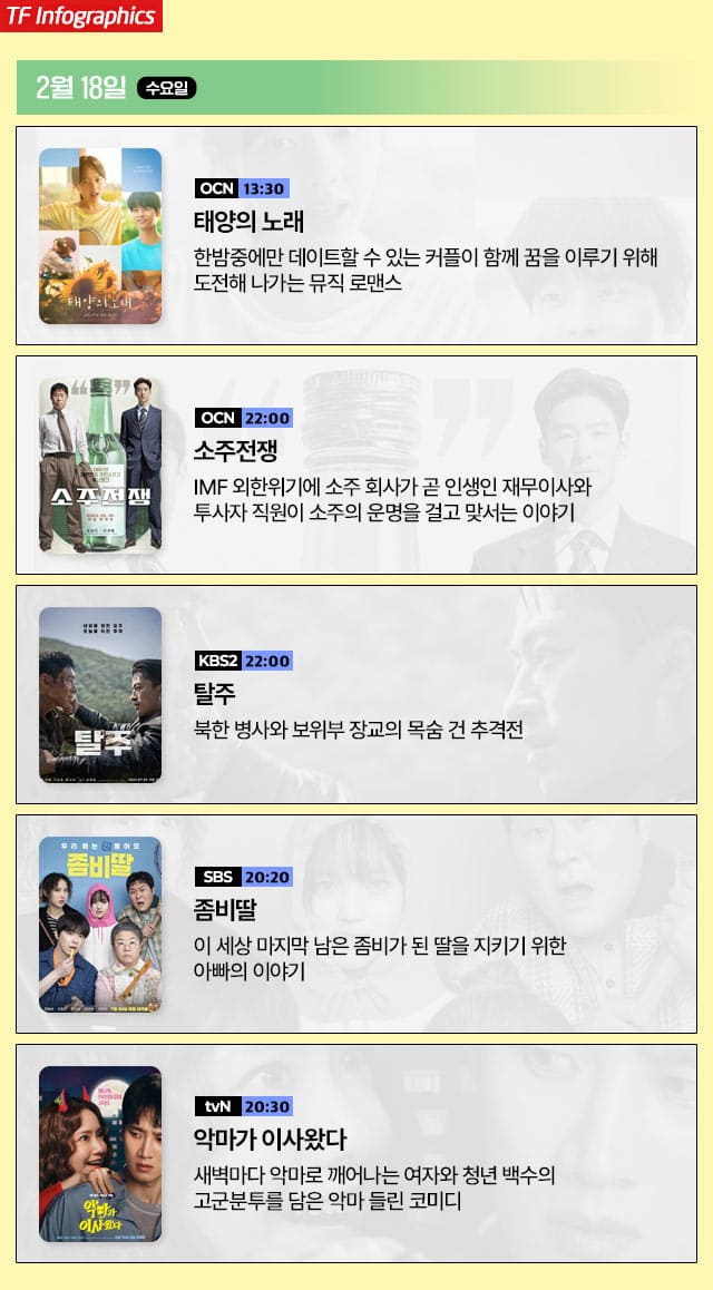 설 연휴 마지막 날에는 전 세대가 볼 수 있는 다양한 장르의 영화가 시청자들과 만난다. 가장 먼저 방영되는 '태양의 노래'는 한밤중에만 데이트할 수 있는 미솔(정지소 분)과 민준(차학연 분)이 음악을 통해 서로 사랑에 빠지며 함께 꿈을 이루기 위해 도전해 나가는 뮤직 로맨스다. 동명의 일본 영화를 리메이크했다.