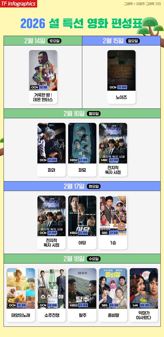 [더팩트ㅣ최수빈 기자] 14일부터 18일까지 이어지는 설 연휴. 길어진 연휴만큼 안방극장에서 만날 수 있는 영화 선택지도 한층 풍성해졌다. 오컬트와 액션, 스릴러는 물론 가족이 함께 즐기기 좋은 코미디와 로맨스까지 장르 역시 다채롭다.