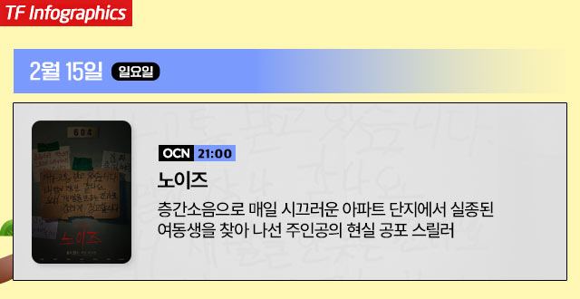 15일에는 영화 '노이즈'가 안방극장에 착륙한다. 작품은 층간소음으로 매일 시끄러운 아파트 단지에서 실종된 여동생을 찾아 나선 주영(이선빈 분)이 미스터리한 사건과 마주하게 되는 현실 공포 스릴러다. 배우 이선빈 김민석 한수아 등이 호흡을 맞췄다.