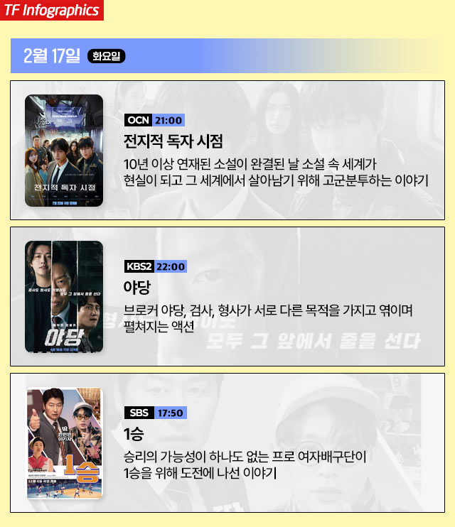 설 당일인 17일에는 '1승' '전지적 독자 시점' '야당'이 공개된다. '1승'은 이겨본 적 없는 감독과 이길 생각 없는 구단주 그리고 이기는 법을 모르는 선수들끼리 승리의 가능성이 하나도 없는 프로 여자배구단이 1승을 위해 도전에 나서는 이야기다. 국내 최초 배구를 소재로 한 영화로, 17일 오후 5시 50분 SBS에서 볼 수 있다.