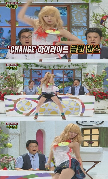 이에 현아는 자신의 솔로곡 '체인지(CHANGE)'에 맞춰 골반댄스를 선보였다. 이 후 남성출연자들이 "좋다" "어질어질하다"는 반응을 보이며 노골적인 멘트를 해 뒤늦게 화제가 됐다.