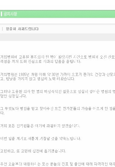 약물 투여로 사망한 시체를 유기한 혐의를 받고 있는 산부인과 전문의 김 모씨(45)가 근무하던 H 산부인과가 병원 게시판에 사과문을 올렸다.