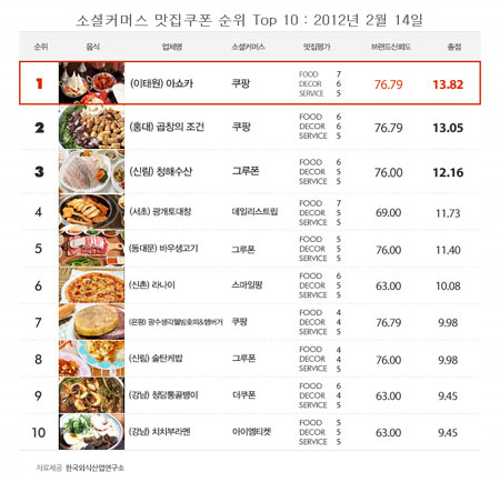 테이스티타임즈(TastyTimes) - 한국외식산업연구소는 2월 14일 소셜커머스 맛집쿠폰 순위 Top 10을 발표했다.