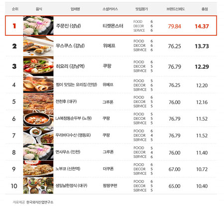 테이스티타임즈(TastyTimes) - 한국외식산업연구소는 4월 16일 소셜커머스 맛집쿠폰 순위 Top 10을 발표했다.