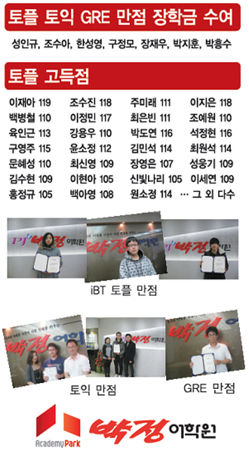 이번 겨울방학 기간 동안에는 토플특강을 통해 단기 점수관리 및 시험 대비, 진학상담, 실전대비 고득점 비법까지 공개한다. 특강은 오전 9:00부터 오후 6:00까지 진행되며, 4대영역 철저수업 및 관리 Homework 완성으로 보다 좋은 결과를 기대할 수 있을 것으로 보인다.