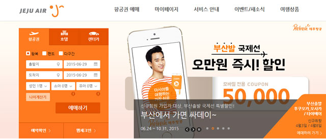 제주항공은 24일부터 10월 31일까지 회원으로 가입한 사람들에게 5만원 할인 쿠폰을 준다. 모바일 전용으로 제공되는 이 쿠폰은 모바일 웹 구매자에 한해 적용된다.
