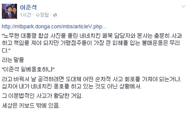 이준석은 2일 자신의 페이스북에 "'노무현 대통령 합성 사진을 올린 네네치킨 페북 담당자와 본사는 충분히 사과하고 책임을 져야 되지만 가맹점주들이 가장 큰 피해를 입는 불매운동은 무리다' 라는 말을 '이준석 일베 옹호하냐'라고 바꿔서 날 공격하면 어떤 순차적 사고 회로를 가져야 되는거냐. 이분법적인 사고가 황당한 것임. 세상은 키보드 밖에 있음"이라는 글을 남겼다.
