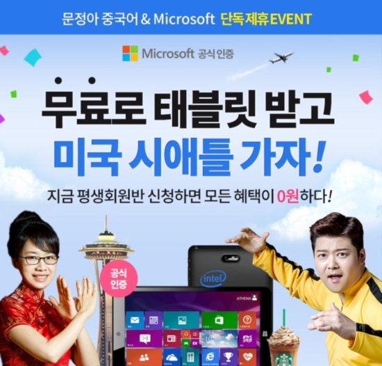 중국어교육 전문 기관 문정아중국어가 Microsoft와의 제휴 기념으로 미국 시애틀행 무료 여행 이벤트를 진행 중이다. 추첨을 통해 매월 2명씩, 총 10명을 선발할 계획이며 문정아중국어의 올패스 평생회원반을 신청한 모든 수강생들을 대상으로 진행된다. 뿐만 아니라 이번 이벤트는 평생회원반을 신청만 해도 Microsoft 공식 인증 윈도우 태블릿을 제공하고 있어 학습자들로부터 큰 호응을 얻고 있다.