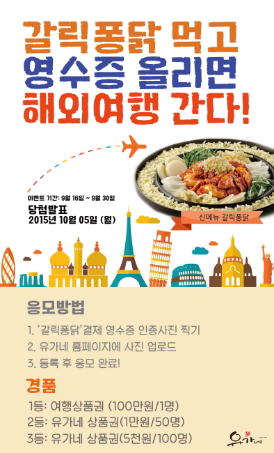 유가네, '갈릭퐁닭' 먹고 해외여행 가세요! 영수증 인증샷 이벤트 열어