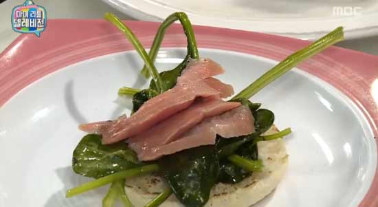 이날 방송에 따르면 먼저 버터와 노른자, 통후추 등을 이용해 '홀랜다이즈 소스'를 만든다. 다음으로 빵 속을 만들기 위해 시금치를 올리브 오일에 살짝 볶고 끊는 물에 소금과 식초를 넣은 뒤 물이 끊으면 회오리를 만든다.