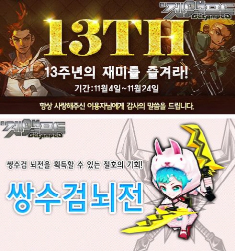 또 겟앰프드 생일인 11월 10일에는 전용 이벤트도 열린다. 5일부터 24일까지 6일 동안 겟앰프드에 출석하면 활활 타오르는 코디 액세서리인 ‘히트업 캔들’을 받을 수 있고, 13주년 기간 동안 대전모드와 챌린지 모드를 이용하면 각각 PTS 30% 증가, 챌린지 전용채널 챌린지 모드 플레이 시 50% 증가 혜택을 누릴 수 있다.