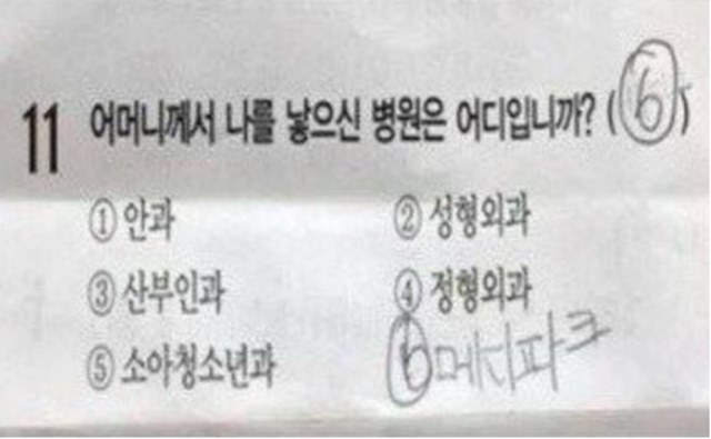 예를 들어 '어머니께서 나를 낳으신 병원은 어디입니까'라는 물음에 정답인 '산부인과' 대신 '메디파크'라며 실제 태어난 병원 이름을 적는 아이부터 '산에서 밥을 지어 먹으면 안 되는 이유'로 "거지로 오해 받을까봐"라고 쓴 아이까지 유형도 다양하다.
