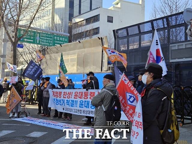 자유통일당 등은 이날 오후 1시부터 헌재에서 약 270m 떨어진 종로구 서울노인복지센터 앞에서 탄핵 반대 집회를 열었다. 윤 대통령 지지자들은 집회 참여를 위해 지하철 안국역 5번 출구로 속속 모여들었다.