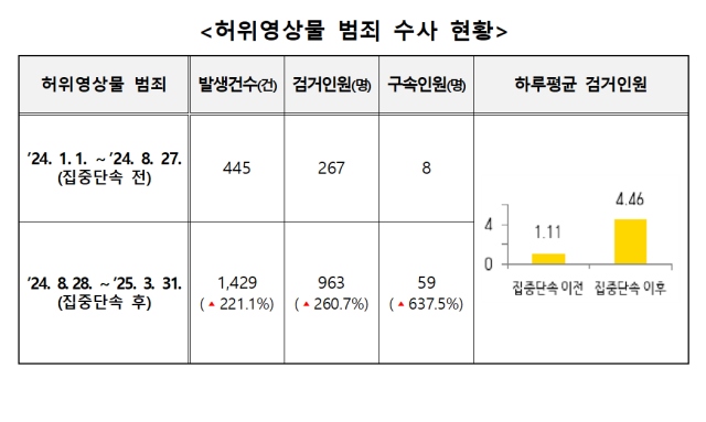 경찰청 국가수사본부(국수본)는 지난해 8월28일부터 올해 3월31일까지 허위영상물 범죄 집중단속을 통해 963명을 검거하고 59명을 구속 송치했다고 17일 밝혔다. 집중단속 전인 지난해 1월1일부터 8월27일까지 검거된 267명보다 260.7% 급증한 수치다.