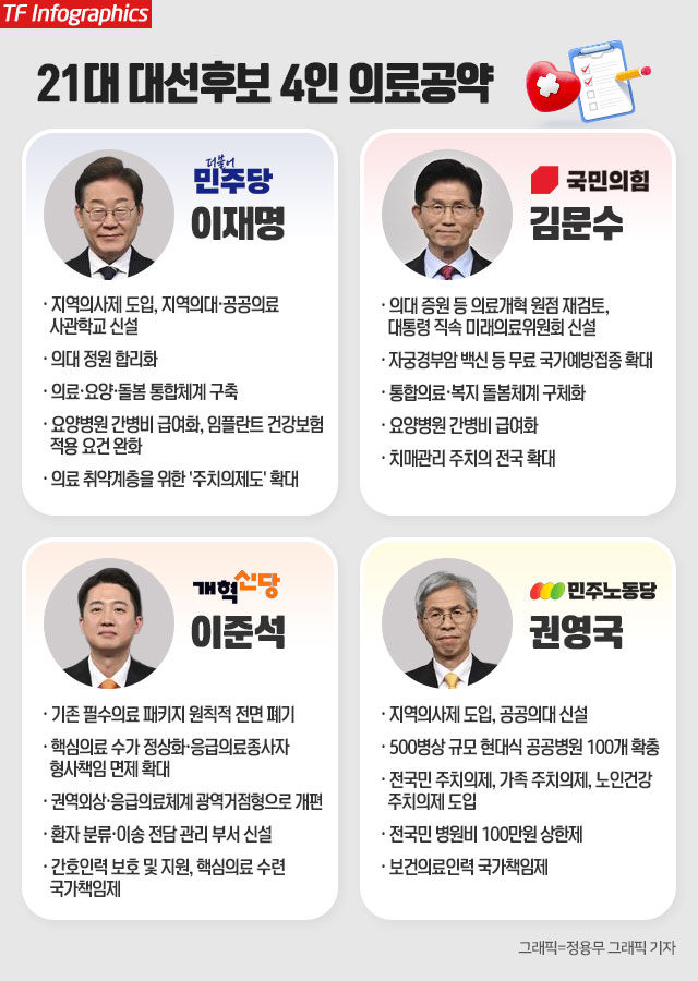 [더팩트ㅣ조채원 기자] '의과대학 2000명 증원'이 윤석열 정부의 대표적인 정책 실패로 꼽히면서 각 당 대선 후보들의 필수·지역의료 확충 공약에 관심이 쏠리고 있다. 김문수 국민의힘, 이준석 개혁신당 대선 후보는 '필수의료 패키지' 등 기존 의료정책 원점 재검토 또는 폐기를 내세웠다. 이재명 더불어민주당, 권영국 민주노동당 후보는 공공병원, 공공의대 설립을 통해 공공·필수·지역 의료 시스템을 보강해야 한다는 입장이다. 민주당, 국민의힘, 민주노동당은 '어르신 공약' 일환으로 요양병원 간병비 급여화(건강보험 적용)를 대선 공약으로 제시했다.