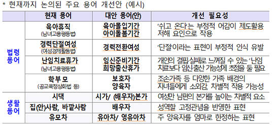 육아휴직, 경력단절여성 등 일부 용어가 직장 내 눈치문화 등으로 제도의 긍정적 취지를 제한하거나 부정적 인식, 편견을 조장할 수 있다는 문제제기가 있어 왔다.