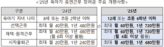 육아기 근로자의 자녀 나이 기준은 만 8세(초등 2학년)에서 만 12세(초등 6학년)로 늘렸다. 육아기 자녀를 둔 근로자가 유연근무를 활용하는 경우 사업주에 대한 지원금을 일반근로자보다 두 배로 인상했다. 시차출퇴근을 활용하는 경우 근로자 1인당 월 최대 40만원(1년 480만원)을, 선택근무나 재택·원격근무 활용 시에는 근로자 1인당 월 최대 60만원(1년 720만원)을 지원받는다.