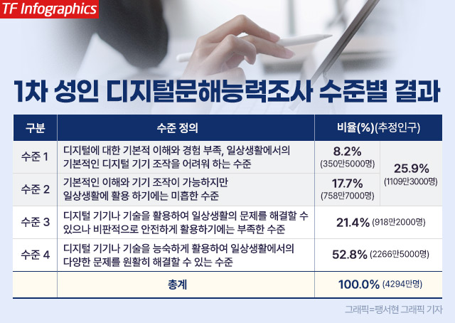 조사는 수준1에서 4까지 총 4개 단계로 수준을 구분해 결과를 공개했다. 수준 1은 디지털에 대한 기본적 이해와 경험이 부족해 일상생활에서 기본적인 디지털 기기 조작을 어려워하는 수준을 의미한다. '수준 1' 성인은 전체의 8.2%(약 350만 명)로, 기본적인 이해와 기기 조작이 가능하지만 일상생활에 활용하기에는 미흡한 '수준 2' 성인은 17.7%(약 758만 명)로 집계됐다. 수준 1·2 성인은 전체의 25.9%에 해당한다. 네 명 중 한 명은 지도 앱으로 길을 찾거나 키오스크를 통한 음식 주문이 원활하지 않은 셈이다.