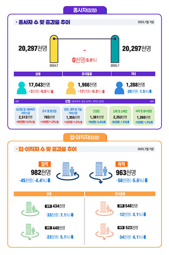 고용노동부가 28일 발표한 '7월 사업체 노동력 조사'에 따르면 지난달 말 기준 종사자 1인 이상 사업체 종사자 수는 2029만7000명으로 전년동월과 유사한 수준이다.