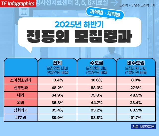 국민 생명과 건강에 직결된 필수과 경우 모집 인원 대비 선발된 비율이 낮았으며 비수도권은 더 저조했다. 필수의료에 포함되는 소아청소년과는 모집 인원 대비 선발 인원 비율은 전체 13.4%에 불과했다. 비수도권은 8%로 10%도 못 채웠다. 산부인과는 모집 대비 선발 비율이 48.2%로 반도 안됐다. 특히 수도권 58.3%, 비수도권 27.6%로 두 배 이상 차이가 났다.