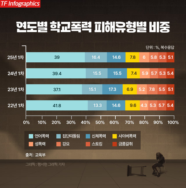 [더팩트ㅣ조채원 기자] 초·중·고 학생 100명 중 2.5명은 학교폭력을 경험했다는 정부 조사 결과가 나왔다. 2020년 이후 5년 연속 증가세다. 피해 유형에서는 집단따돌림과 사이버폭력 피해가 늘었다.