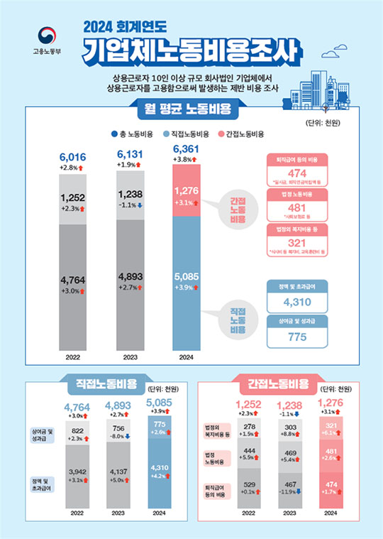 30일 고용노동부가 발표한 '2024 회계연도 기업체노동비용조사' 결과에 따르면 상용근로자 10인 이상 기업체의 상용근로자 1인당 월평균 노동비용은 636만1000원으로 2023년 대비 3.8%(23만원) 증가했다.