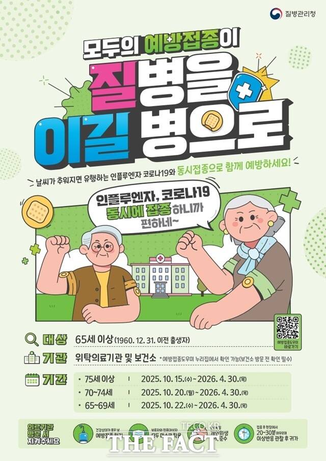 65세 이상 어르신은 독감(인플루엔자)과 코로나19 예방접종 대상에 모두 해당하며, 두 가지 백신을 동시 접종할 수 있다.