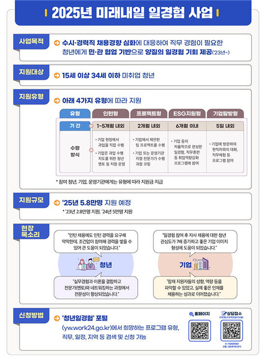 노동부는 '미래내일 일경험 사업'을 통해 5만8000명의 청년들에게 일경험 기회를 제공하고 있다. 참여 청년들이 직무역량 향상 및 직무탐색 등 측면에서 긍정적 반응을 보였고, 참여 기업들도 우수 인재 탐색채용 기회로 활용할 수 있어 높은 재참여 의사(98%)를 보였다.