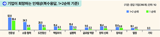 응답 기업의 52.8%는 청년 채용 시 '전문성'을 우선으로 요구하고, '전문성'을 평가하기 위해 '전공'(22.3%), '인턴제 등 일경험'(19.1%), '직무 관련 교육·훈련'(17.4%) 등을 주요하게 보는 것으로 나타났다.
