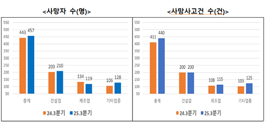 고용노동부가 25일 발표한 3분기(누적) 산업재해 현황 부가통계에 따르면 올해 1∼9월 재해조사 대상 사고 사망자는 457명으로, 지난해 3분기 누적 443명보다 14명(3.2%) 늘었다. 사망 사고 건수는 411건에서 440건으로 29건(7.1%) 증가했다.
