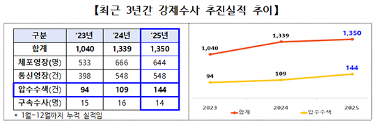 지난해 강제수사는 체포영장 644건, 통신영장 548건, 압수수색 검증 영장 144건, 구속영장 14건 등 총 1350이다. 이는 2024년(1339건)에 비해 소폭 증가했다.