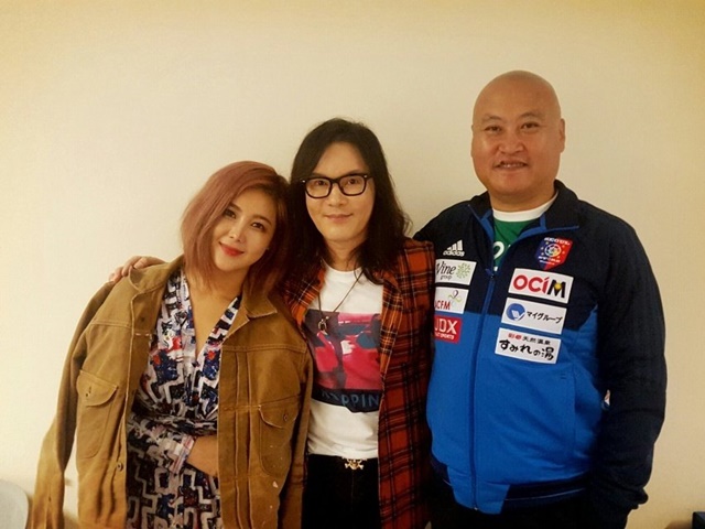 김영철 회장(오른쪽)이 후원행사에 참석한 뒤 기념 사진을 찍고 있다. 가운데는 가수 조영남. 사진 위는 연예인 축구 해외 원정경기에 합류해 깜짝 공연까지 한 가수 솔비와 김종서, 사무총장 윤택상(왼쪽부터). /한김회
