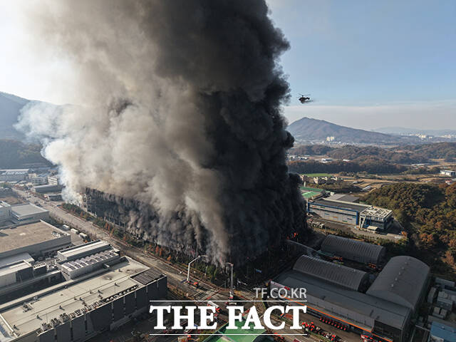 [더팩트ㅣ이효균 기자] 충남 천안시 동남구에 위치한 이랜드패션 물류센터에서 지난 15일 발생한 화재 현장에서 이틀째 진화 작업이 진행 중이다.