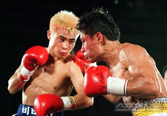 | ▲ WBC 라이트플라이급 타이틀을 차지한 최요삼이 태국의 사만 소루자투롱에게 레프트 스트레이트를 가하고 있다. |