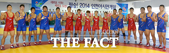 [더팩트ㅣ이새롬 기자] 레슬링 국가대표 선수들이 11일 오전 서울 노원구 공릉동 태릉선수촌 필승관에서 열린 2014 인천아시안게임 대한민국 레슬링 국가대표 미디어데이에서 취재진을 향해 포즈를 취하고 있다.