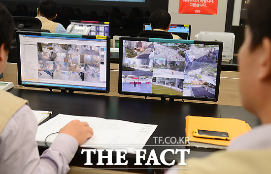 [더팩트ㅣ이새롬 기자] 열흘간 진행된 제2롯데월드 저층부 프리-오픈(Pre-open) 행사의 마지막날인 16일 오전 서울 송파구 제2롯데월드 종합방재센터에서 관계자들이 CCTV를 확인하고 있다.
