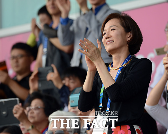[더팩트 | 드림파크승마장=이효균 기자] '2014 인천 아시안게임' 승마 마장마술 개인전 종목이 23일 오후 인천 드림파크승마장에서 열린 가운데 한화 김승연 회장의 부인 서영민 씨가 아들 김동선 선수가 은메달을 수여받자 박수를 치고 있다.