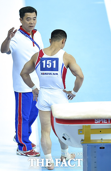 [더팩트 | 남동체육관=최진석 기자]북한의 리세광이 25일 저녁 인천 남동체육관에서 열린 '2014 인천 아시안게임' 기계체조 남자 뜀틀 결선에서 멋진 연기를 선보이다 착지에 실패한 후 머리를 잡고 있다.