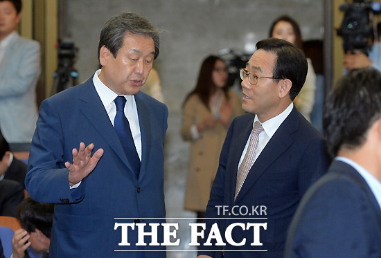 [더팩트│국회=문병희 기자] 30일 오후 서울 여의도 국회에서 열린 새누리당 의원총회에서 김무성 대표(왼쪽)와 주호영 정책위의장이 대화를 나누고 있다.