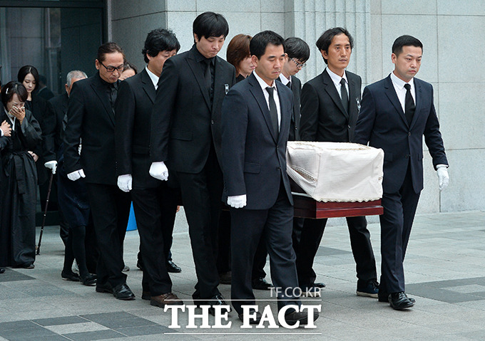 [더팩트ㅣ김슬기 기자] 31일 오전 서울 송파구 풍납동 서울아산병원에서 고 신해철의 발인이 엄수된 가운데 밴드 넥스트의 멤버들이 고인의 관을 운구하고 있다.