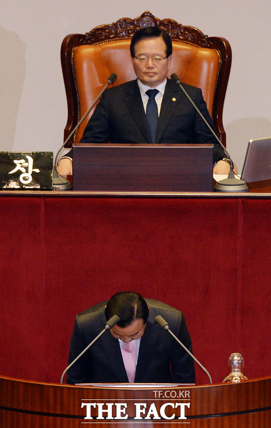 [TF포토] 대정부질문 출석해 첫 인사 하는 이완구 국무총리