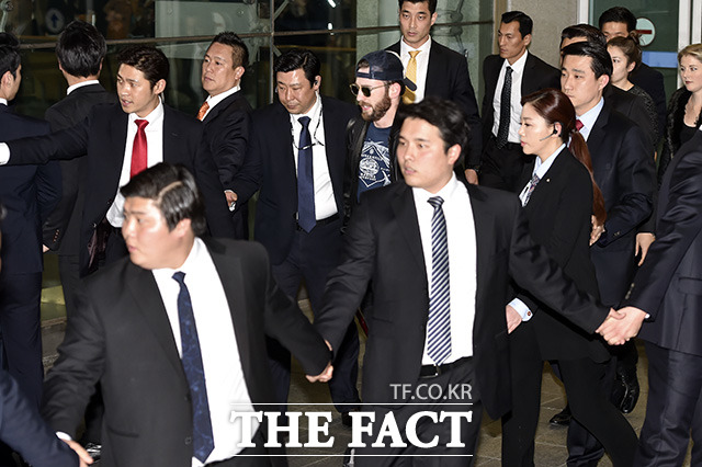 '어벤져스2'의 배우 크리스 에반스(가운데)가 16일 오후 인천국제공항을 통해 입국하고 있다.