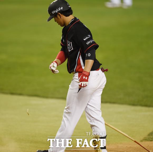 26일 오후 서울 잠실야구장에서 열린 '2015 타이어뱅크 KBO 리그' kt위즈와 LG트윈스의 경기에서 8회초 kt 하준호가 삼진아웃으로 물러나자 신경질적으로 방망이 내던지고 있다. 하준호는 4연타석 삼진을 당했다.