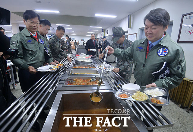 [더팩트ㅣ수원=문병희 기자] 국민의당 천정배(왼쪽), 안철수 공동대표가 19일 경기도 수원 공군 제10전투비행단을 방문해 병사식당에서 식판에 음식을 담고 있다.