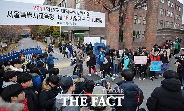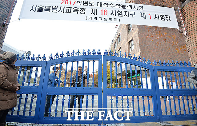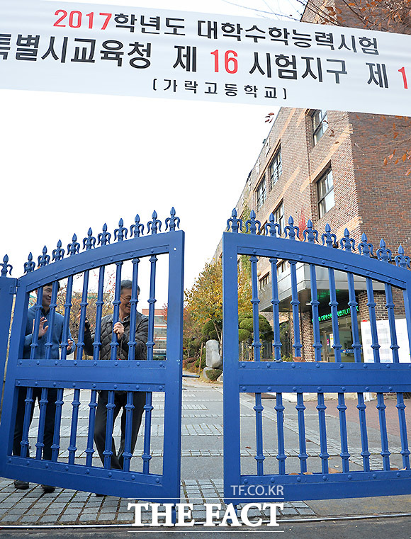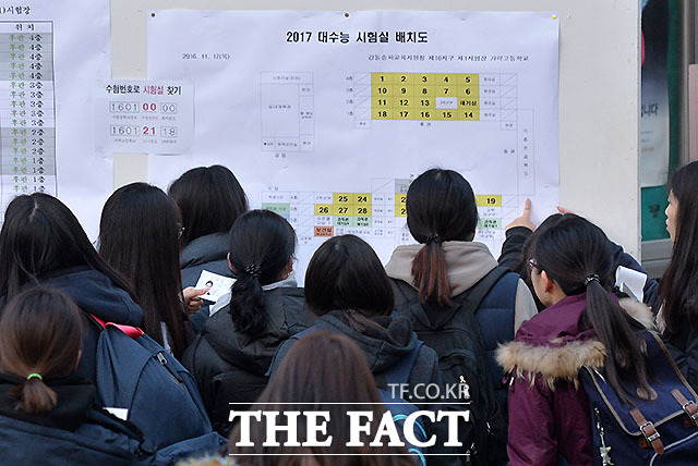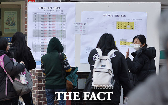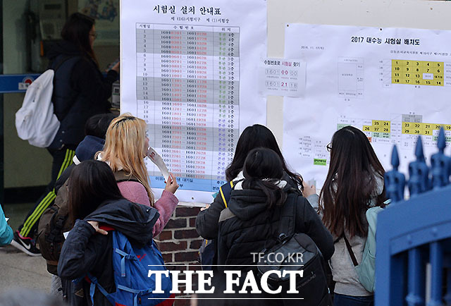 [더팩트ㅣ문병희 기자] '2017 대학수학능력시험'이 17일 전국적으로 실시된 가운데 서울 송파구 가락고등학교에 수험생들이 입실 전 고사장을 확인하고 있다.
