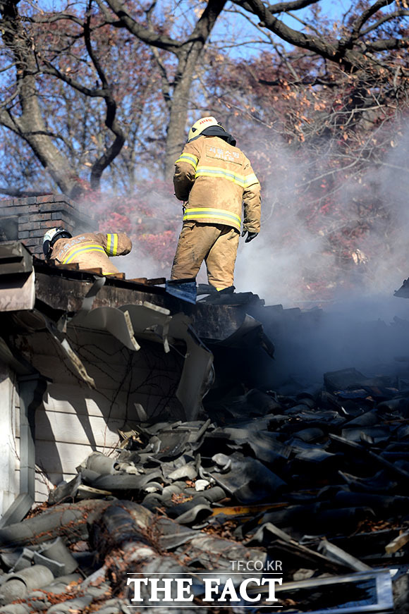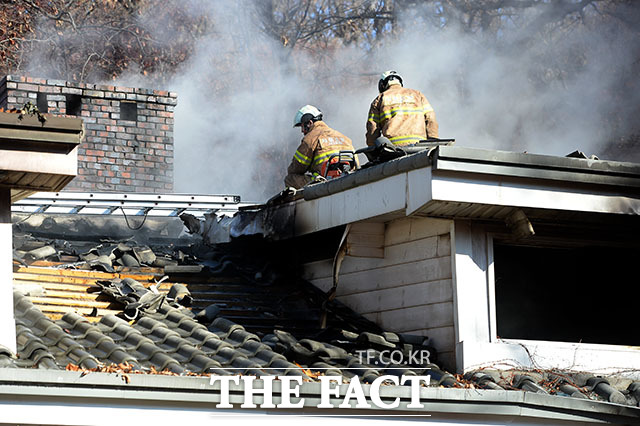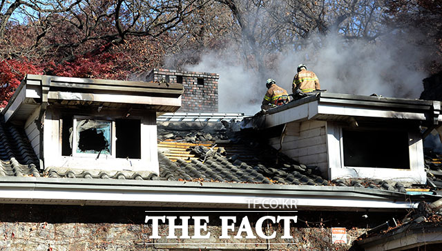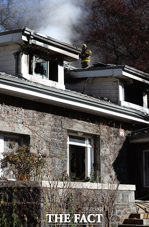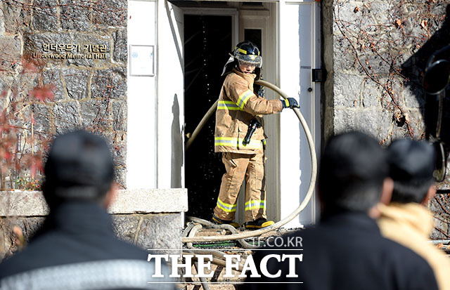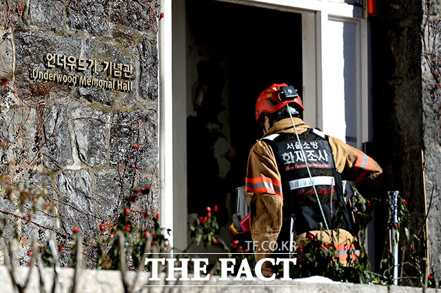 [더팩트ㅣ임세준 인턴기자] 24일 오전 서울 서대문구 연희동 연세대학교 신촌캠퍼스 언더우드가 기념관에서 화재가 발생해 소방당국이 화재를 진압하고 있다. 불은 24일 오전 8시경 지하 보일러실에서 시작된 것으로 추정되며 화재가 2층까지 번져 기념관 내부 대부분이 불에 탔으나 인명피해는 발생하지 않았다.