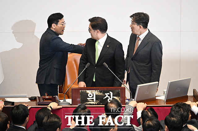 [더팩트ㅣ국회=박헌우 기자] 박찬대 더불어민주당 원내대표(왼쪽 첫 번째)가 27일 오후 국회 본회의에서 한덕수 국무총리 탄핵소추안 표결에 대해 항의하는 권성동 국민의힘 대표 권한대행 겸 원내대표에게 항의를 하고 있다.