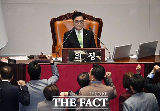 [더팩트ㅣ국회=박헌우 기자] 27일 오후 서울 여의도 국회에서 열린 본회의에서 한덕수 국무총리 탄핵소추안 표결에 대해 국민의힘 의원들이 항의하고 있는 가운데 우원식 국회의장이 눈을 감고 있다.